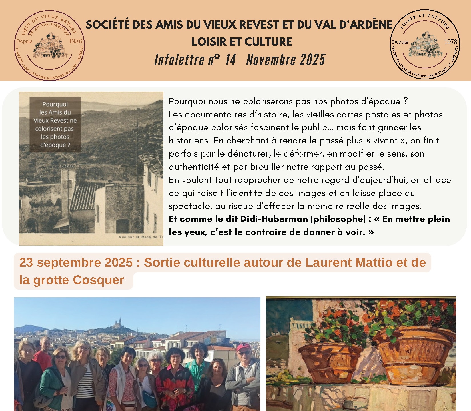 Ces activités proposées par nos associations ne sont accessibles que sur réservation et dans la limite des places disponibles. Les randonnées sont ouvertes à tous. Les sorties culturelles et les balades photographiques sont réservées aux adhérents à jour de leurs deux cotisations à nos associations : Amis du Vieux Revest | Loisir & Culture. >Voir bulletin d'adhésion : clic ici.